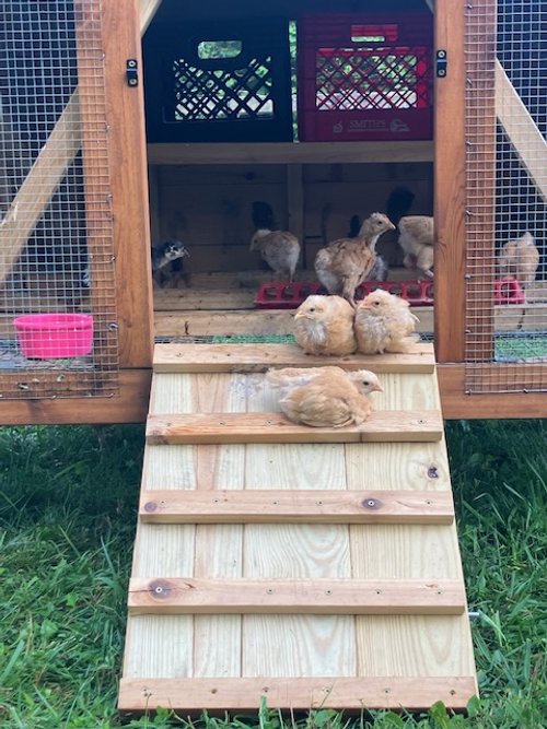 Direct from the brooder, our chickens live on pasture from three weeks to processing in an enclosed, mobile chicken tractor. They have constant access to sunshine, grass, bugs, and fresh water. They are moved 1-2x daily to prevent over saturation from their manure and fresh pasture to explore. Along with foraging, they are fed organic grains, and never receive added hormones or antibiotics. No need!